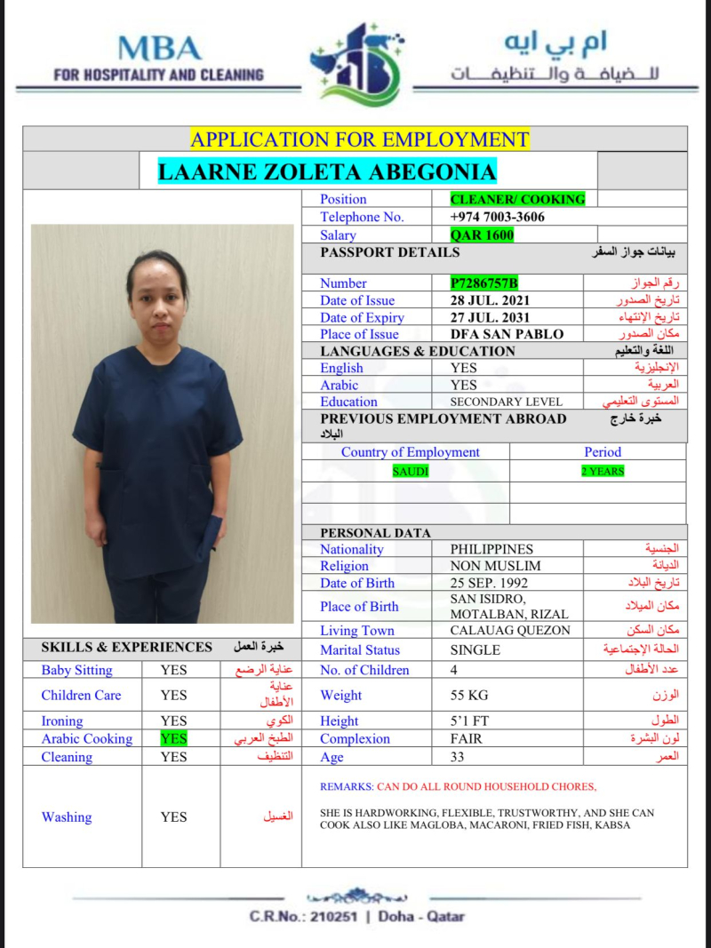 | Previous Experiences : 1 YEAR | Prof. Skills : طبخ,غسيل ملابس,كي ملابس,التنظيف,تربية الاطفال, |