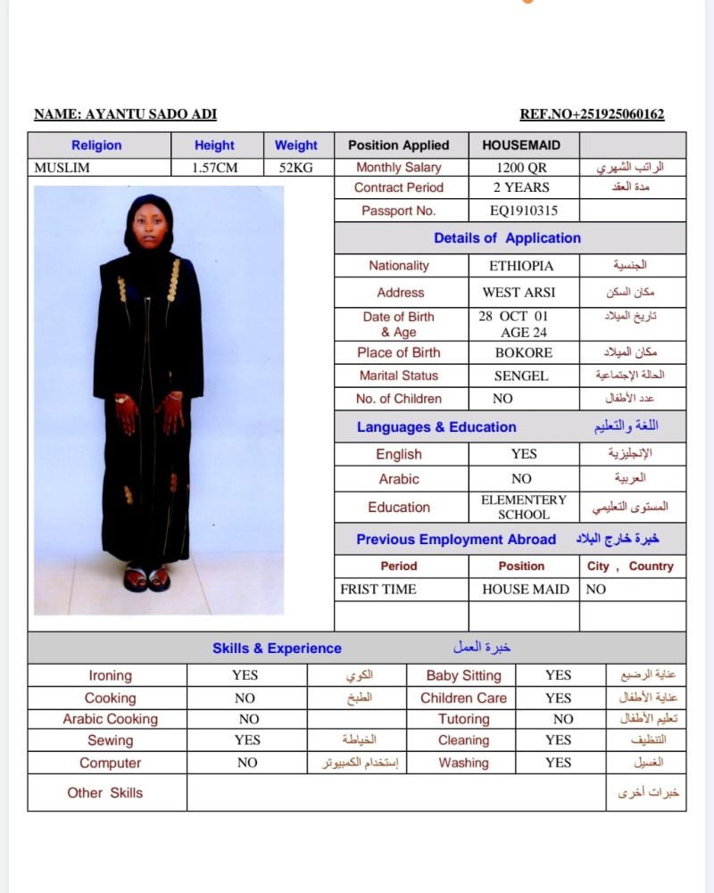 | الجنسية : إثيوبيا | العمر : 24 سنة |