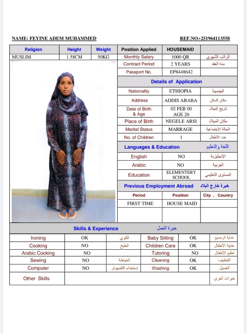 | المهنة : DOMESTIC WORKER | الجنس : أنثى |