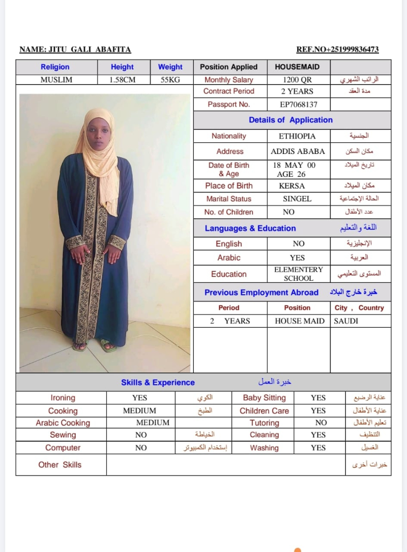 | الجنسية : إثيوبيا | العمر : 26 سنة |